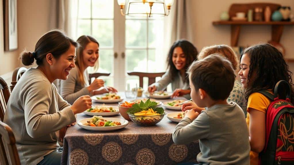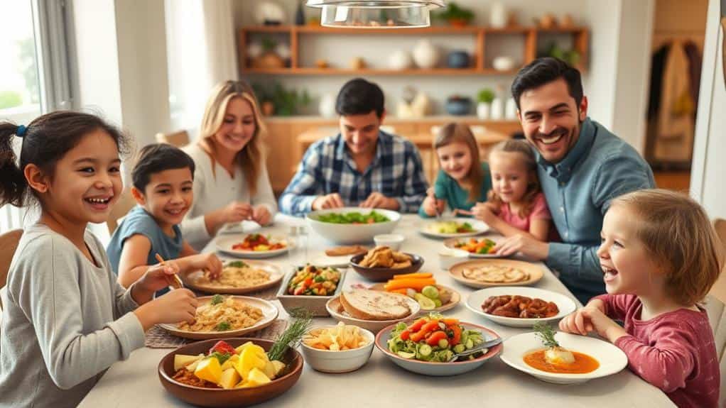 Envision transforming family meals into a cornerstone of your child's daily routine. By eating together, you're not just sharing food; you're building healthy eating habits that last! Consider this: regular family meals help your kids feel secure and discourage unhealthy snacking. Now, who wouldn't want that? With a stable routine, your child can enjoy a balanced diet and feel more at ease. Additionally, incorporating natural vitamins and supplements for kids can further enhance their nutrition and overall well-being. Creating these routines doesn't have to be boring. Involve your kids! Let them help plan and prepare meals. It's like a mini cooking show, right in your kitchen! This not only gives them a sense of ownership over their food choices but also teaches them about nutrition. Plus, it can lead to better emotional health. Bonus: kids who regularly dine with their families tend to do better in school!